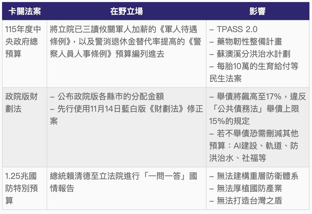 行政、立法關係惡化,行政院送到立院審議的115年度中央政府總預算,連付委都沒有;院版《財劃法》、以及1.25兆元國防特別預算則在程序委員會被擋下。眼看總預算審查遙遙無期,政院喊話,攸關百萬人使用的TPASS通勤月票、每胎10萬生育補助等民生法案都無法推動。不過藍委吃了秤鉈鐵了心,認為民進黨就是自卡政府,先不依法編列立院三讀通過的預算,還要求在野黨放行總預算,「帶頭鬧事的是執政黨,我們愛莫能助」。至於院版財劃法與1.25兆國防預算,藍營也設下前提條件,朝野互不讓步的態勢未見鬆動,三項與錢相關法案短期內恐難解套。