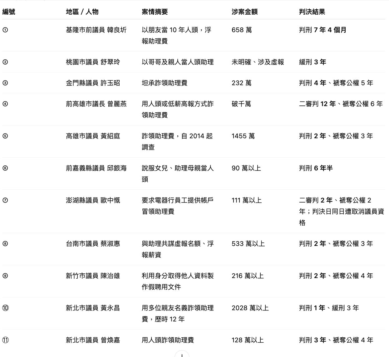 根據張育萌的整理,包括:基隆巿前議員韓良圻,用朋友當 10 年人頭,浮報 658 萬助理費,判刑 7 年 4 個月;桃園市議員舒翠玲遭桃檢起訴,調查涉嫌以哥哥和親人當助理人頭,桃園地院判緩刑 3 年;金門縣議員許玉昭坦承,詐領 232 萬元,金門地院判刑 4 年、褫奪公權 5 年。