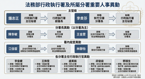 署內組室也有主管異動,包括法制及行政救濟組組長江佳蓉改任綜合規劃組組長,簡任行政執行官林靜怡則調升為法制及行政救濟組組長。兩組為行政執行署在政策、法制、制度規劃上的核心單位,本次調整被視為強化署本部法制作業與行政支援能力的重要配置。