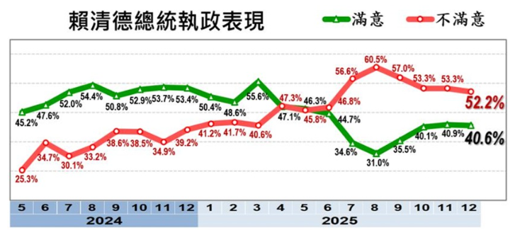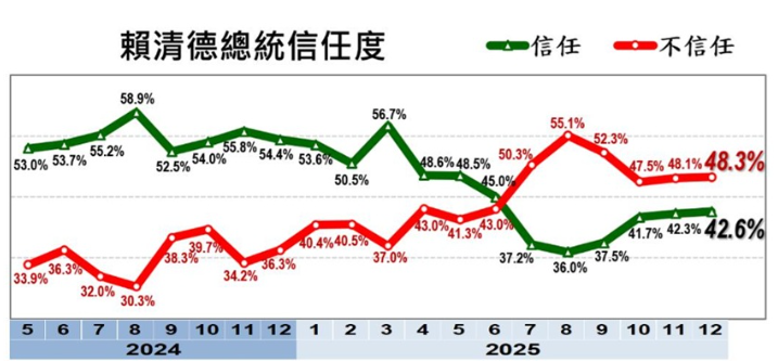 《美麗島電子報》今(29日)公布最新「12月國政民調」,針對「總統賴清德信任度、施政滿意度」、「閣揆卓榮泰施政滿意度」進行調查,結果顯示,有42.6%民眾信任賴清德、48.3%不信任。而賴清德施政滿意度,有40.6%滿意,相較上月減少0.3個百分點、另外有52.2%不滿意,不滿意賴總統執政表現已連續半年超過5成2,與就任時相較,不滿意民眾已增加26.9個百分點。另外,卓榮泰施政則是38.1%滿意,相較上月下降1.4個百分點、另有44.3%不滿意,上升0.5個百分點。