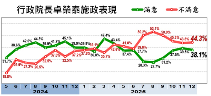 針對「卓榮泰施政滿意度」,有38.1%滿意卓榮泰擔任閣揆表現,其中14.8%很滿意、23.3%還算滿意,比上月減少1.4個百分點,另有44.3%不滿意,其中28.3%很不滿意、16%有點不滿意,比上月微增0.5個百分點,未明確回答的有17.6%。