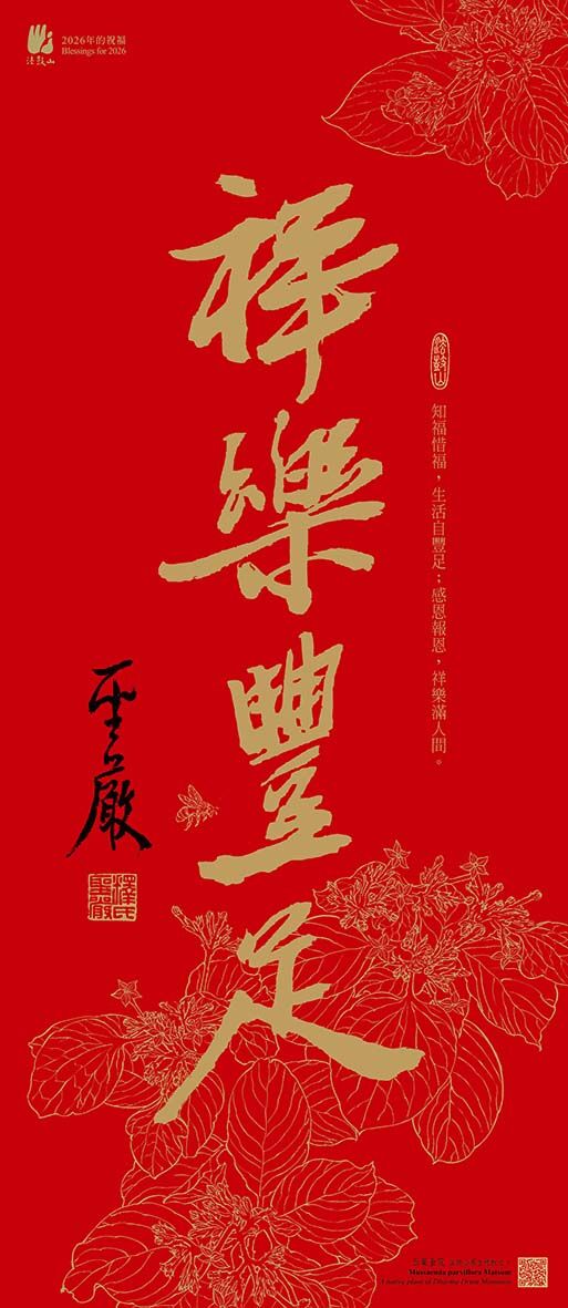 2026年法鼓山年度主題為「祥樂豐足」,不僅是一份新年祝福,更是一種踏實安穩的生活方式。法鼓山方丈和尚果暉法師表示,只要每個人從自己做起、從心開始,「知福惜福,生活自豐足;感恩報恩,祥樂滿人間。」