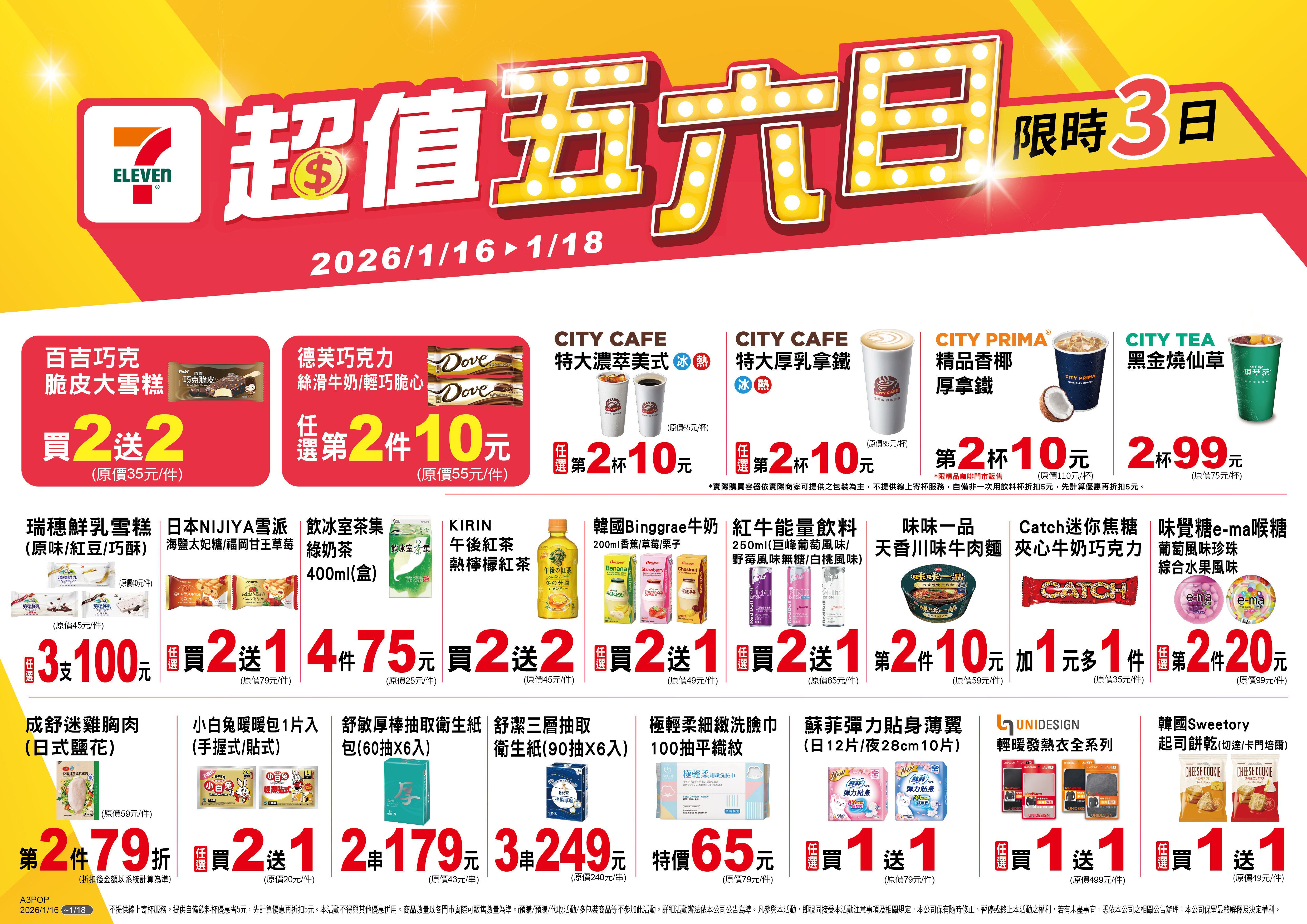 7-ELEVEN「超值五六日」自1月16日至1月18日限時3天登場,從零食、飲料、咖啡、生活用品通通有優惠。CITY CAFE特大濃萃美式、特大厚乳拿鐵,同步推出「第2杯10元」;瓶裝飲料方面,KIRIN午後紅茶(熱檸檬紅茶)推出「買2送2」。