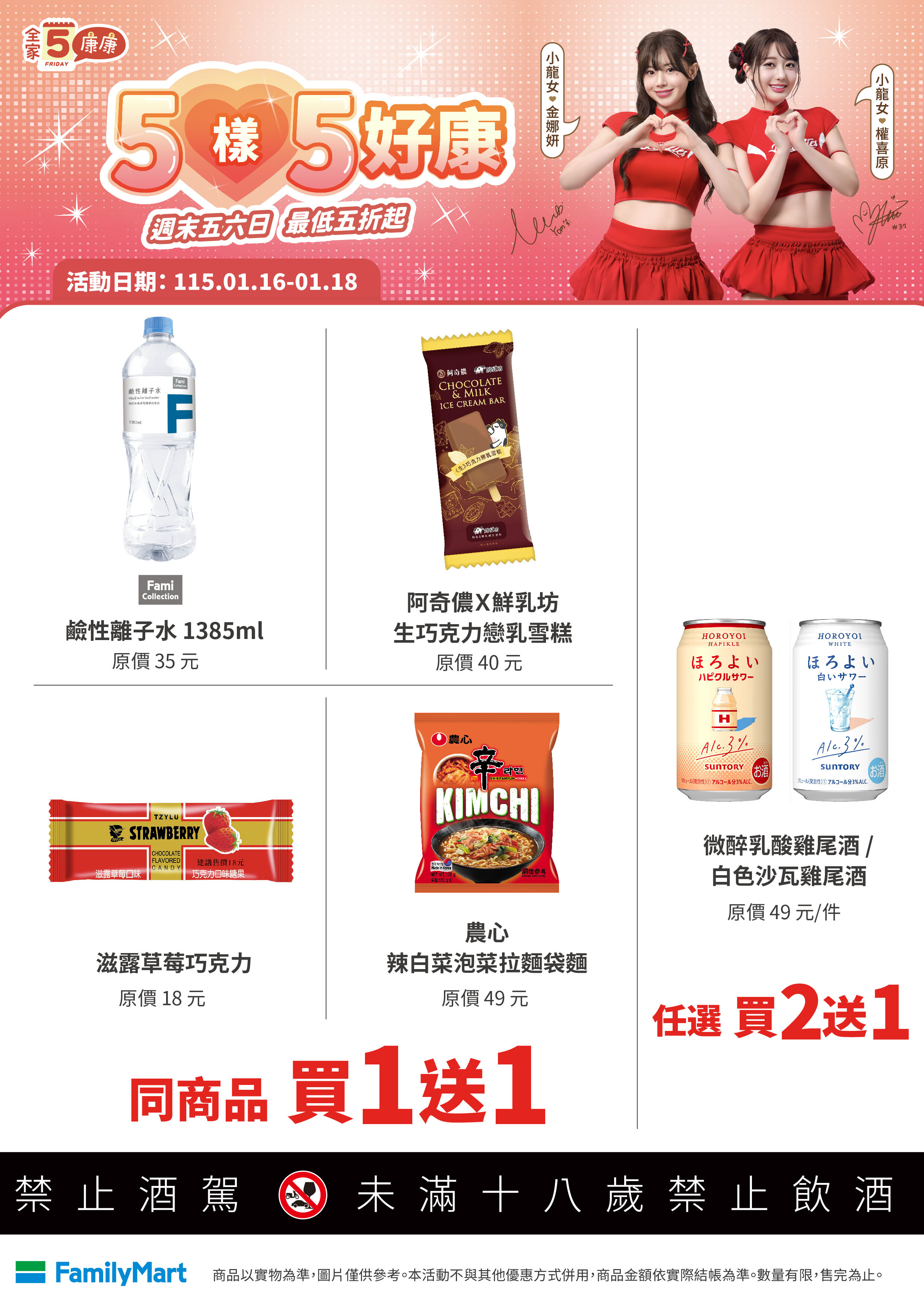 ●全家「康康5」自1月16日至1月18日,指定夯品買1送1: