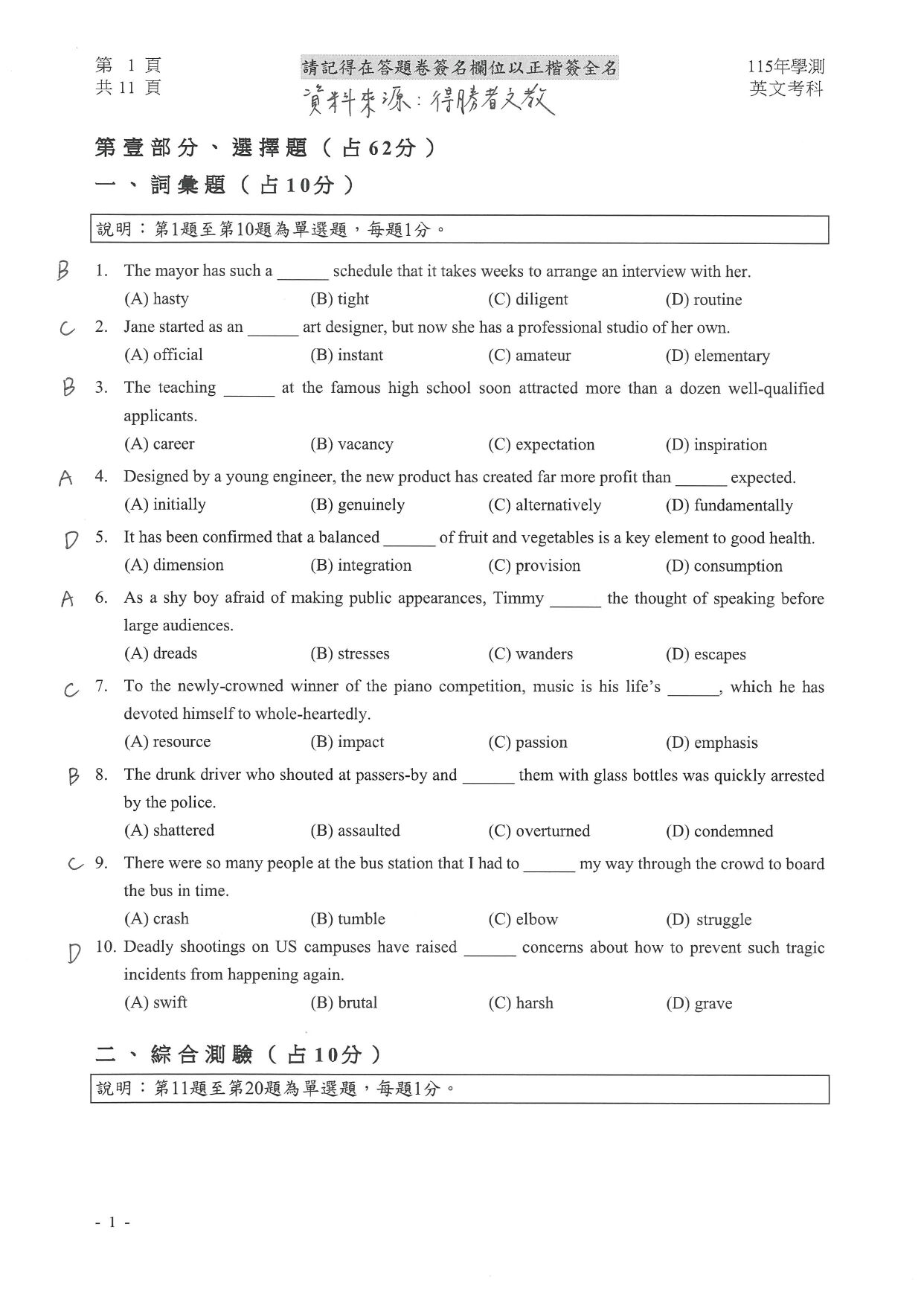 115學年度大學學測今(18日)進入第二天,今年有12萬1535人報考,第一節上午考英文科,根據大考中心統計,英文科共有12萬959人報考,2797人缺考,缺考率2.31%,較去年2.34%微幅下降0.03%。得勝者文教提供英文試題參考解答,正確答案以大考中心公布為準。