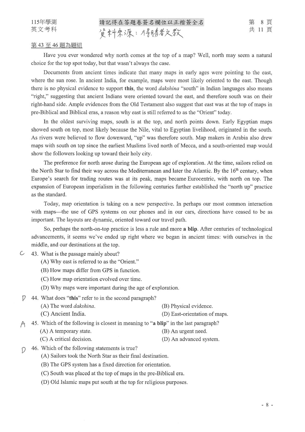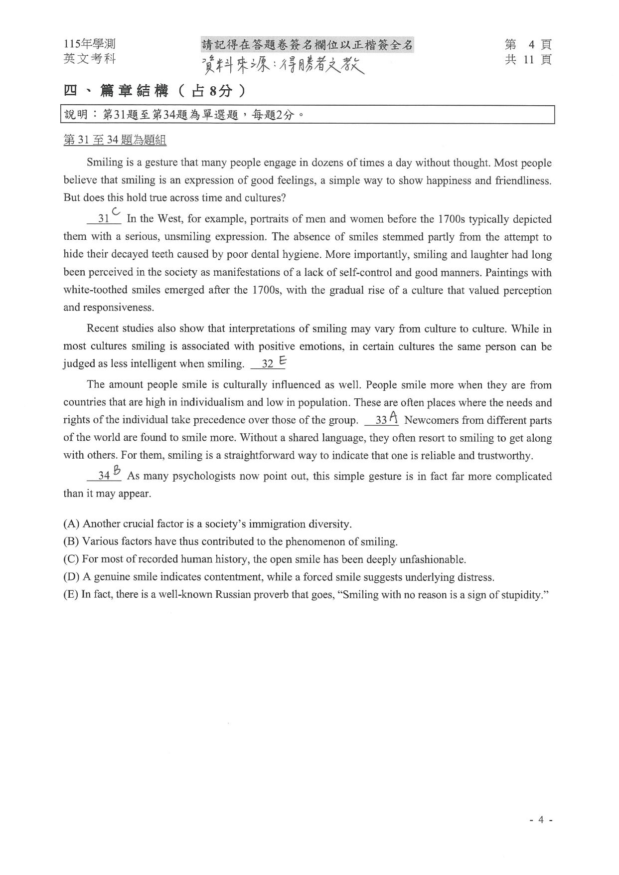 「篇章結構」改為五選四的模式,雖然這是新制後的改變,但老師們認為這次該大題難度適中,屬於「友善」的題型,只要懂得分析結構用字(如 another, thus)即可解題。