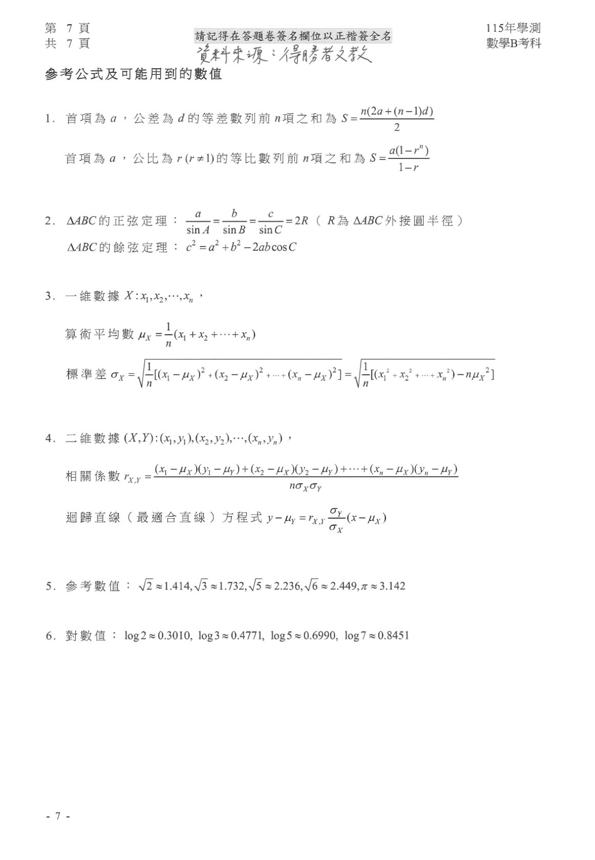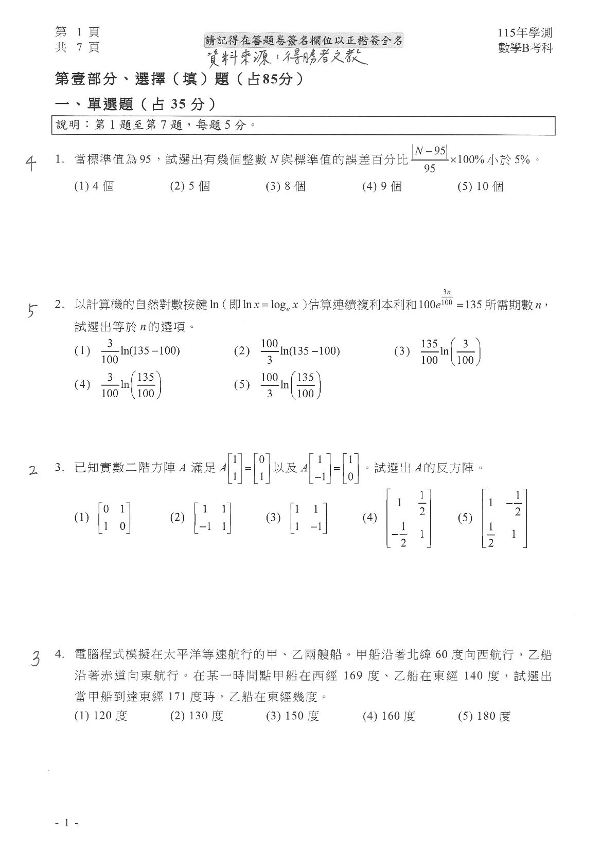 115學年度大學學測今(19日)邁入最後一天,上午第一科考數B,共10萬1718 人報考,4176人缺考,缺考率4.11%。得勝者文教提供數學B試題參考解答,正確答案以大考中心公布為準。