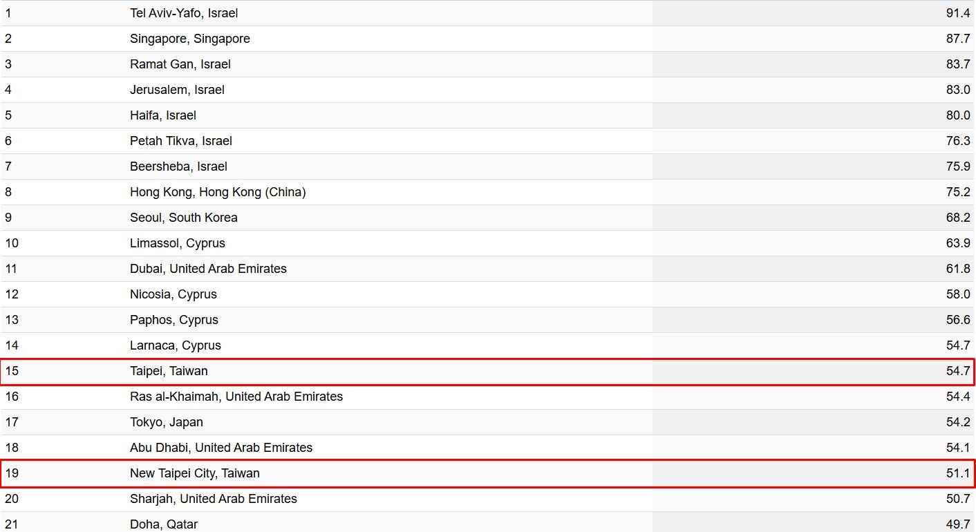 如果單看亞洲,生活成本指數最高的是以色列特拉維夫(91.4),接下來第2至5名依序為新加坡(87.7)、以色列拉馬特甘(83.7)、以色列耶路撒冷(83.0)、以色列海法(80.0)。