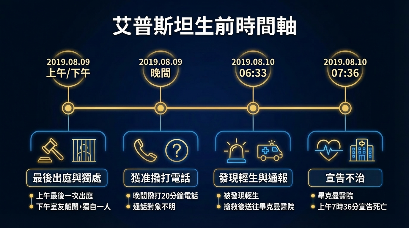 2019年8月9日上午,艾普斯坦最後一次出庭,下午室友離開。當晚他被允許撥打一通20分鐘的電話,並由獄警協助撥號,但報告未透露通話對象是誰。