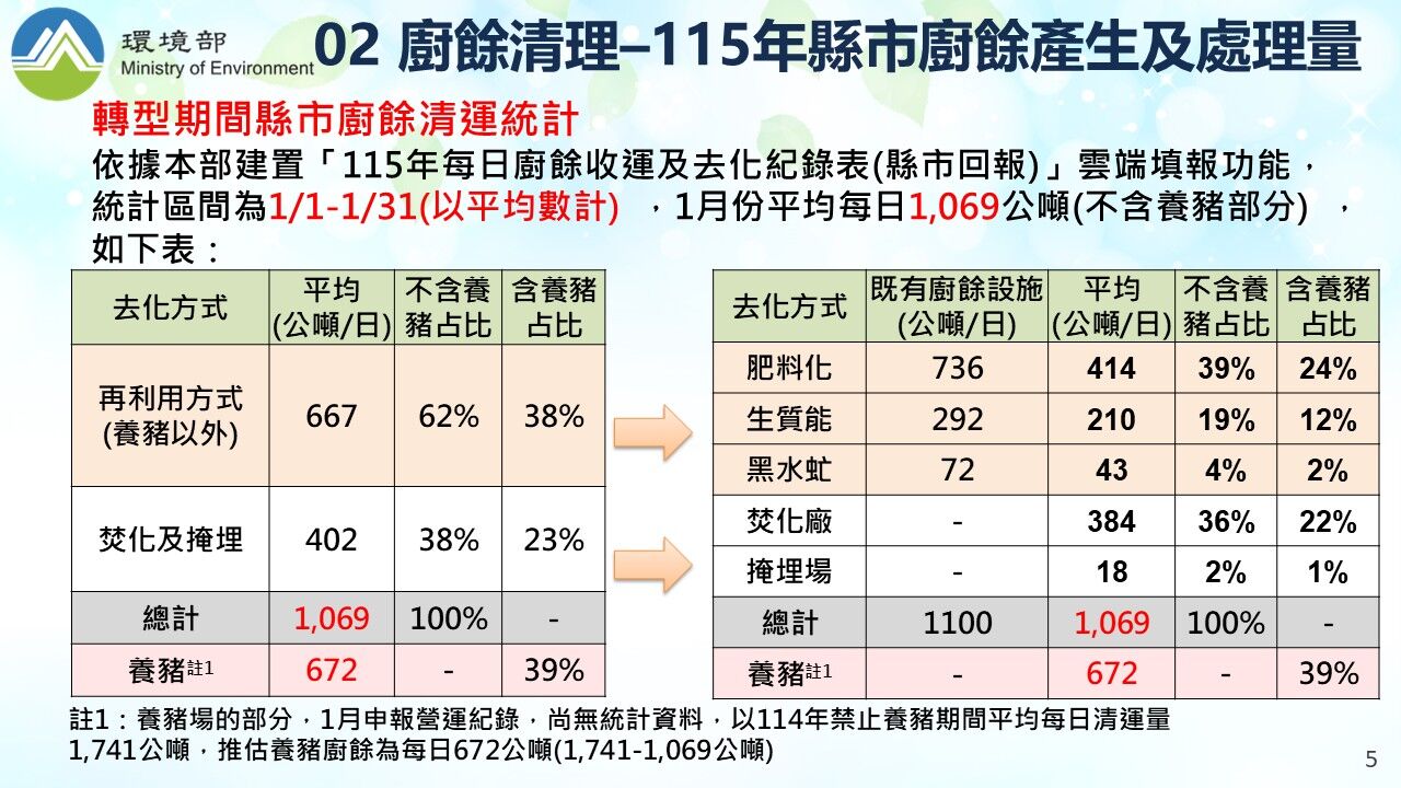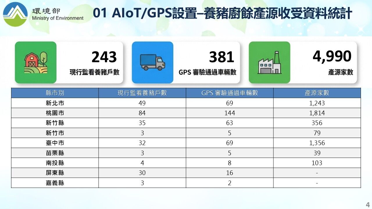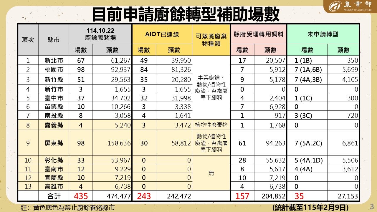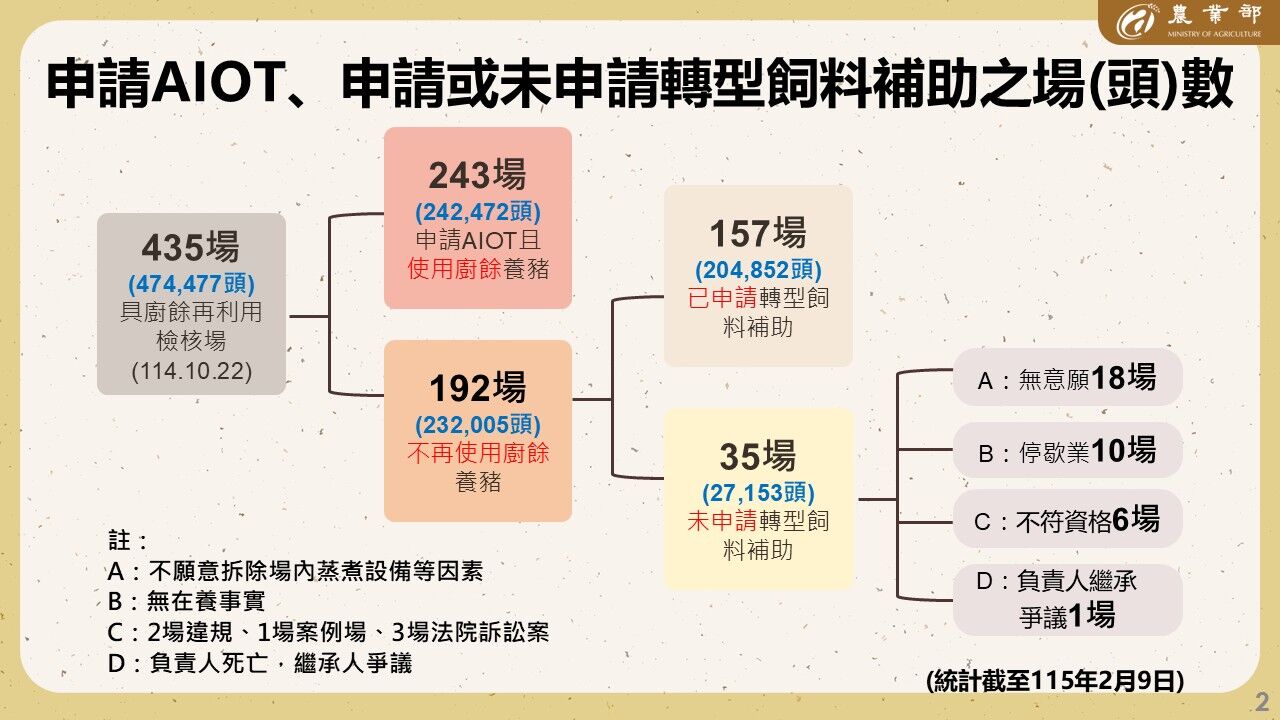 農業部說明,在中央與地方相關環保及農業主管機關協力推動下,截至115年1月31日止,已有243場養豬場完成AIOT溫度監控設備建置,並經納管得使用廚餘養豬最晚至115年12月31日止;另有157場已申請轉型飼料補助,由政府協助轉用飼料養豬。