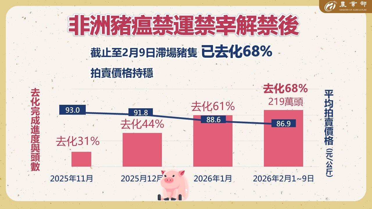 農業部說,在解禁後啟動毛豬產銷調節方案,目前滯留豬隻去化進度達68%,情形良好,肉品市場交易秩序及價格維持穩定,國產豬肉之民生供應無虞。後續政府將持續加強稽查,防杜非法使用廚餘,確保養豬產業平順轉型。