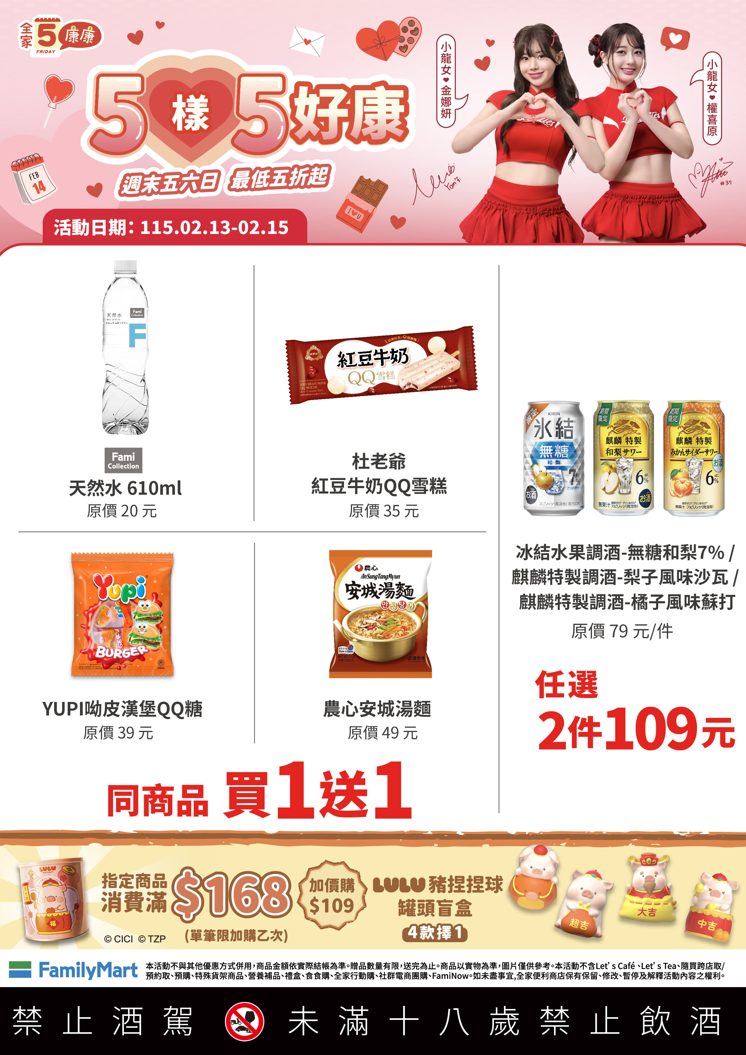 全家於2月13日至2月15日推出「5樣5好康」周末優惠,多款零食、飲料與泡麵祭出「買1送1」,包括:Fami Collection天然水610ml(原價20元)、杜老爺紅豆牛奶QQ雪糕(原價35元)、YUPI呦皮漢堡QQ糖(原價39元)、農心安城湯麵(原價49元),同商品皆享「買1送1」優惠。