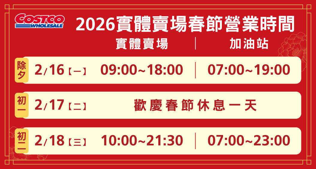 好市多(COSTCO)全台門市、加油站,春節營運時間異動如下。