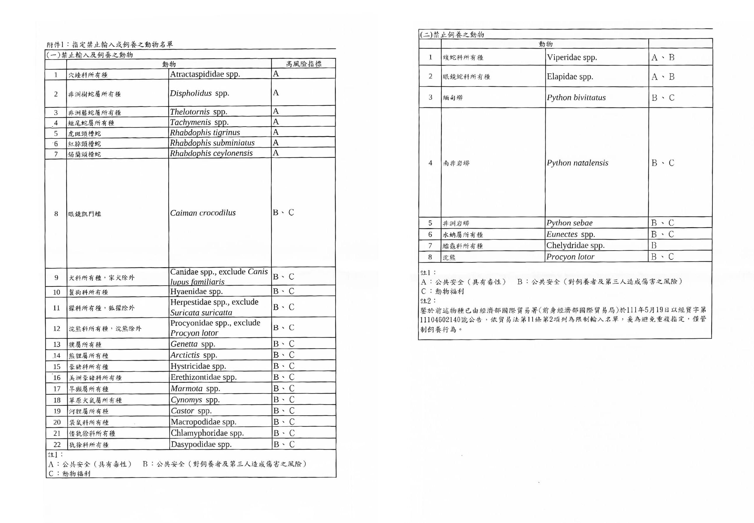 根據動保司說明,這次評估主要圍繞三大方向,其中公共安全包含A類有毒物種及B類公共安全危害,評估是否有對飼養者或第三人造成生命危害的風險;C類動物福利則包含評估該物種是否適合家庭環境飼養、有無足夠空間飼養,以及動物飲食等需求。只是,相關評估如何進行、標準如何界定,並未在第一時間完整對外說明,使得外界只能看到結果,卻難以理解判斷過程。