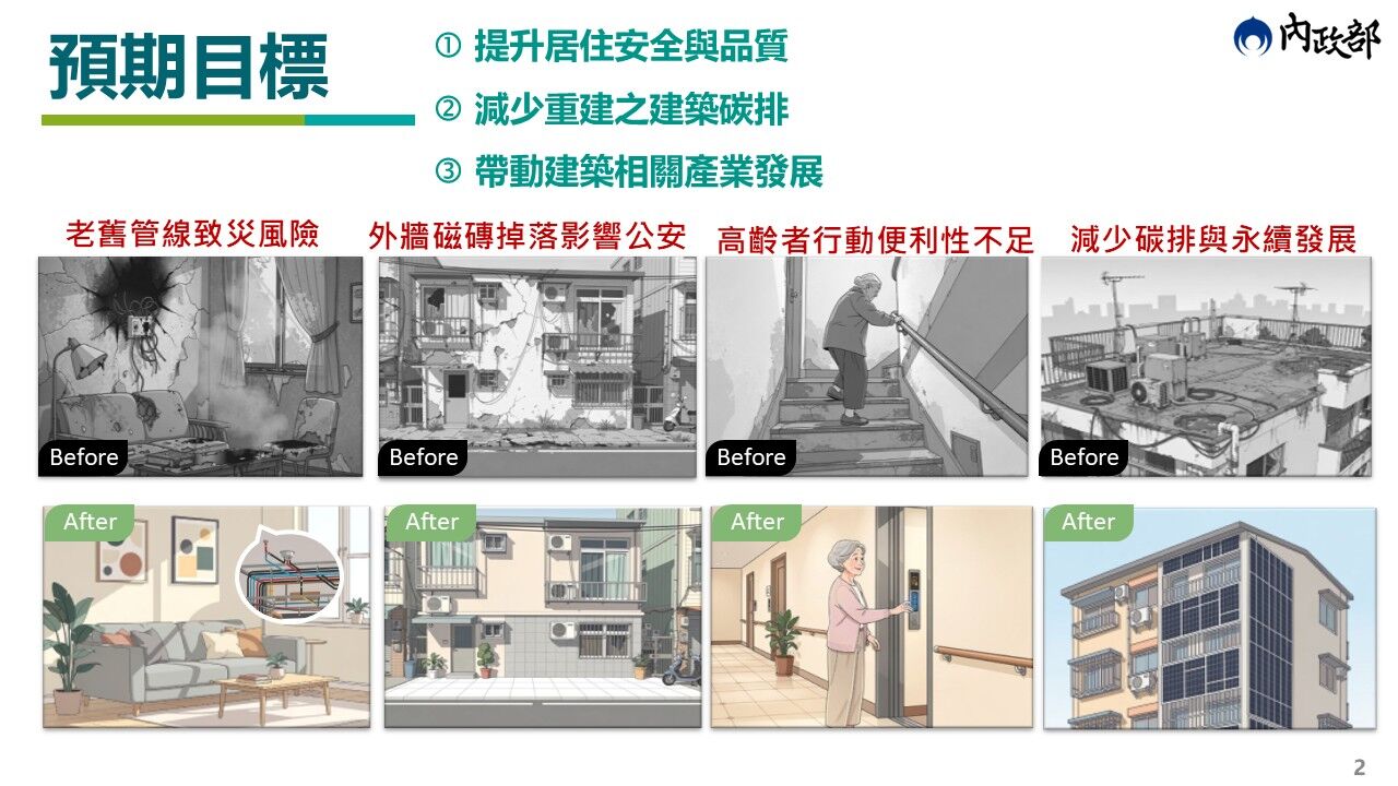 行政院長卓榮泰說,我國屋齡30年以上建築物,已逾半數存在許多空間機能不足、無障礙設施不足、管線老化及高齡者居住不便等問題。面對我國面臨超高齡社會、極端氣候、地震風險及國際情勢變動等種種挑戰,積極改善既有建築物機能並提升居住環境,是當前政府守護人民生命財產安全及提升國家整體韌性的重要工作。