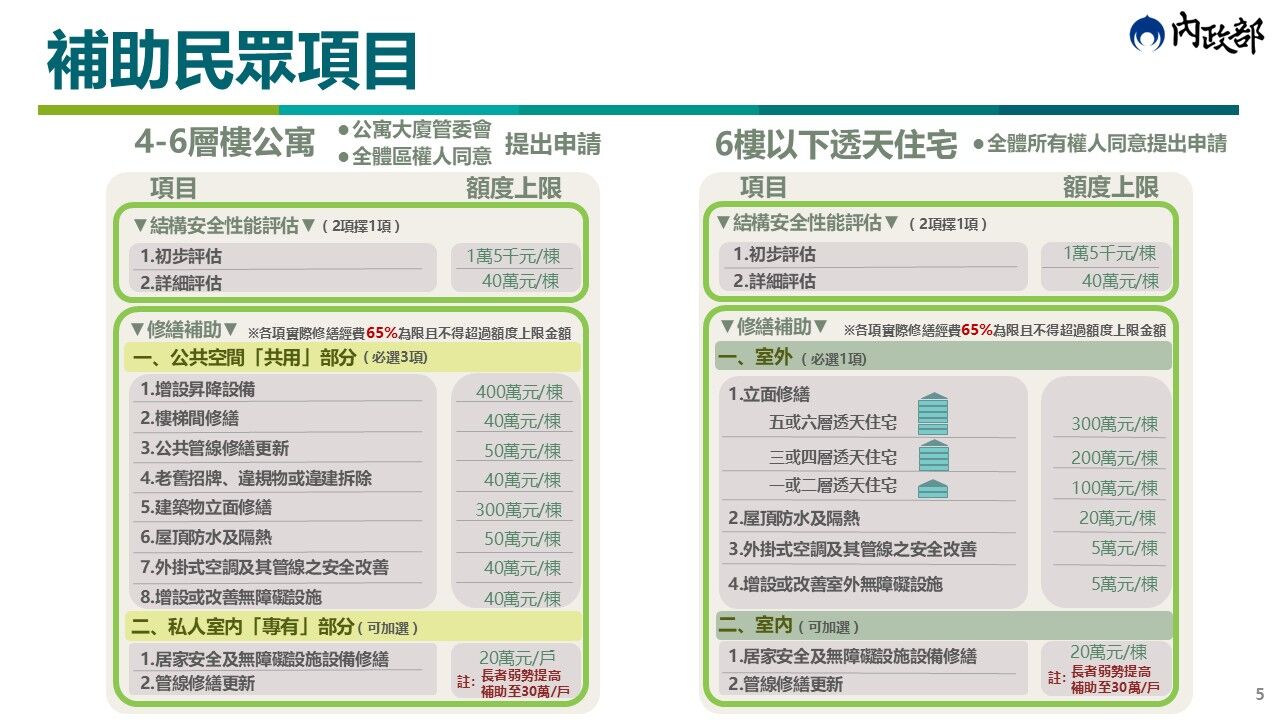 以公寓為例,室外補助項目包括外牆整修、屋頂防水隔熱、樓梯間修繕及公共管線更新、外掛式空調管線整理、老舊招牌及違規物或違建拆除、增設電梯與無障礙設施等8項公共安全與機能改善工程,須至少選擇3項,方可申請室內居家安全優化項目,如扶手設置、防滑改善、高低差消除及防墜設施等。若住戶中有65歲以上長者或弱勢族群,室內修繕補助每戶最高可加碼至30萬元,讓高齡者與家人住得更安心、更便利。