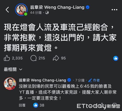 根據交通部高速公路局即時路況顯示,台82線往嘉義交流道方向車流壅塞嚴重,部分路段幾乎動彈不得,也連帶影響國道1號南下、北上進出水上交流道的車流。至於銜接燈區核心的168縣道(嘉朴公路),因實施交通管制與分流措施,加上賞燈人潮持續湧入,目前回堵長度已超過3公里,現場交通壓力相當大。