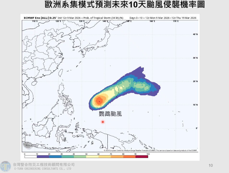 ▼歐洲系集模式預測未來10天颱風侵襲機率圖。(點圖可放大/翻攝賈新興YouTube)