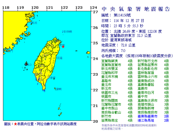台灣東北部地區27日深夜11點05分發生規模7.0地震。地震發生以後,不少網友在網路上回報,「新北超有感」、「還好搖不久」、「桃園市區搖晃超明顯」、「桃園不只4級吧?超搖的。」