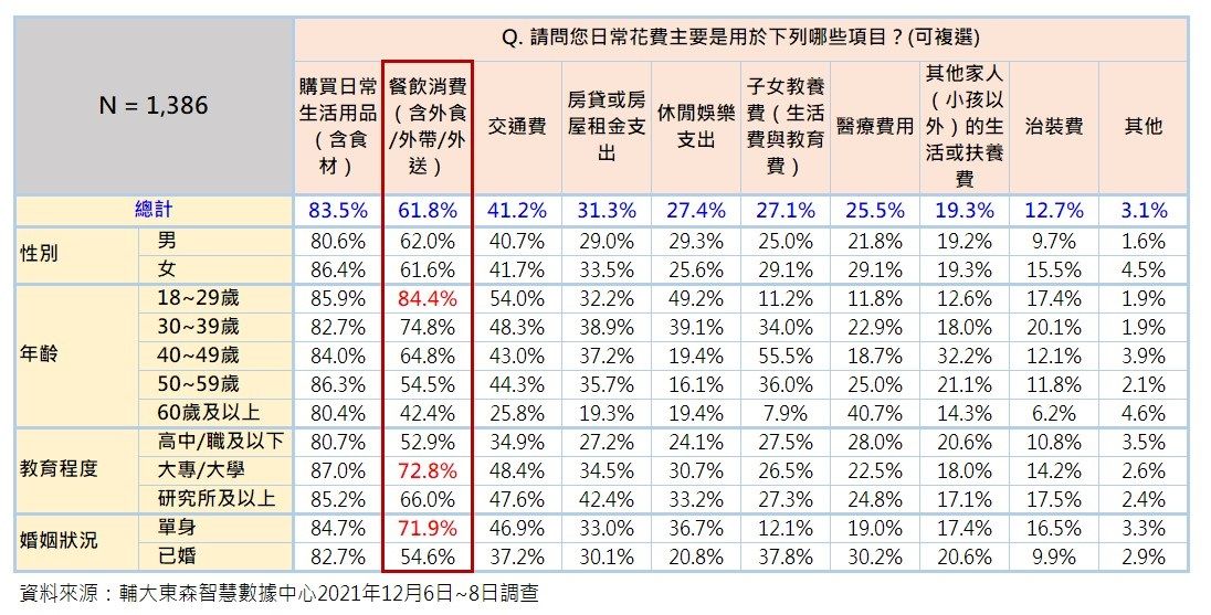 根據調查顯示,民眾對於餐飲支出甚高,日常主要花費項目中餐飲消費(含外食/外帶/外送)占比61.8%,僅次於「購買日常生活用品(含食材)」的83.5%,其中又以年齡18-29歲(84.4%)、教育程度為大專/大學(72.8%)、未婚單身者(71.9%)比例最高,顯示年輕族群無疑為現在飲食消費的主體。